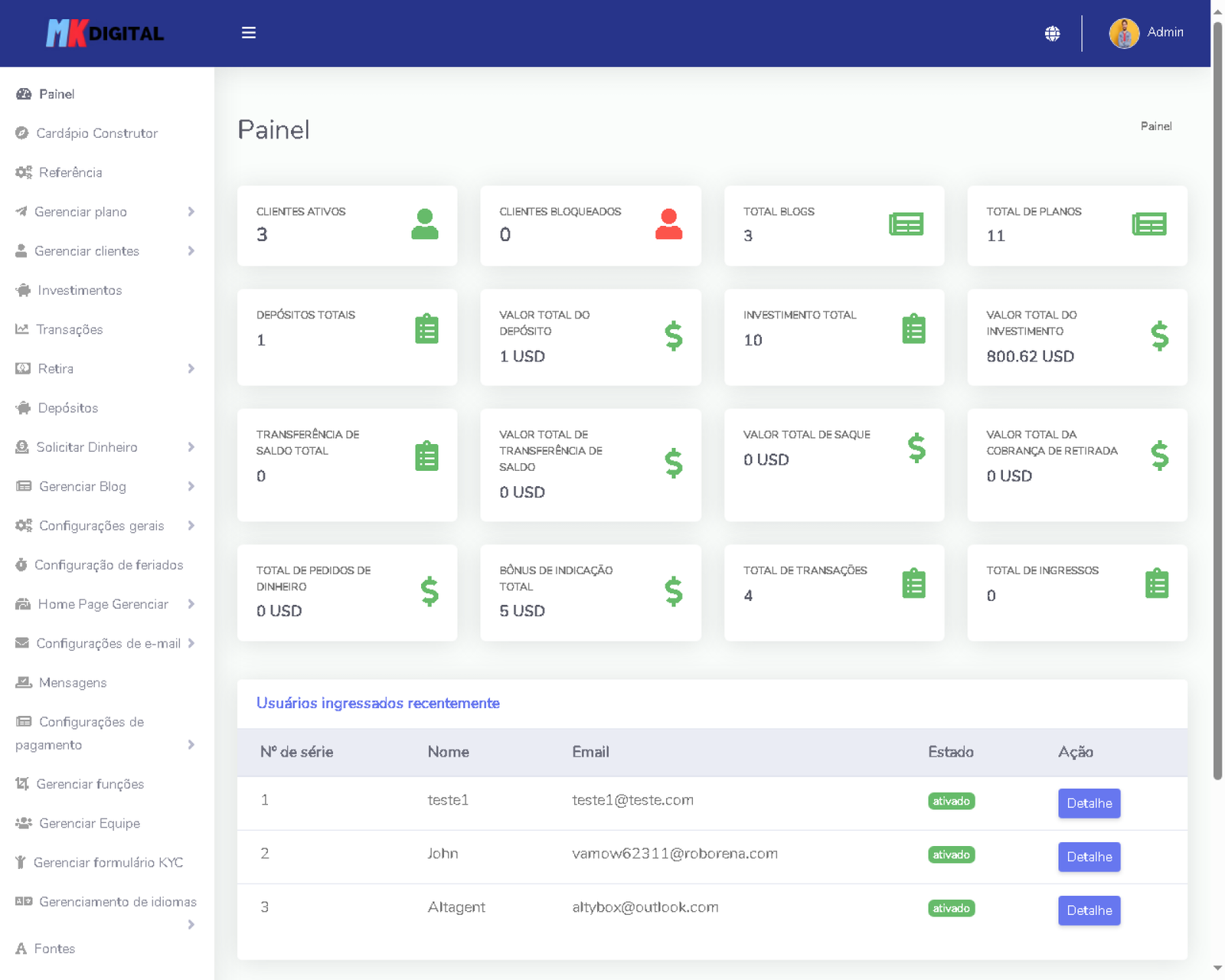 Os usuários podem se cadastrar gratuitamente e podem investir em diferentes planos. De acordo com o plano, os usuários receberão bônus do sistema após o investimento. vem com recursos como Saque, Depósito, Planos de Investimento, Bônus, Comissão de Referência, Transferência de Dinheiro, Solicitação de Transferência de Dinheiro, Enviar Solicitação de Dinheiro, 2FA, etc. Além disso, o Usuário obterá adequadamente todos os detalhes da transação. O administrador obterá lucro com a transferência de dinheiro, bem como com a porcentagem de retirada. Tudo é dinâmico e pode ser configurado no painel de administração. Possui um forte sistema de proteção de injeção de SQL que manterá esse sistema longe de hackers.
