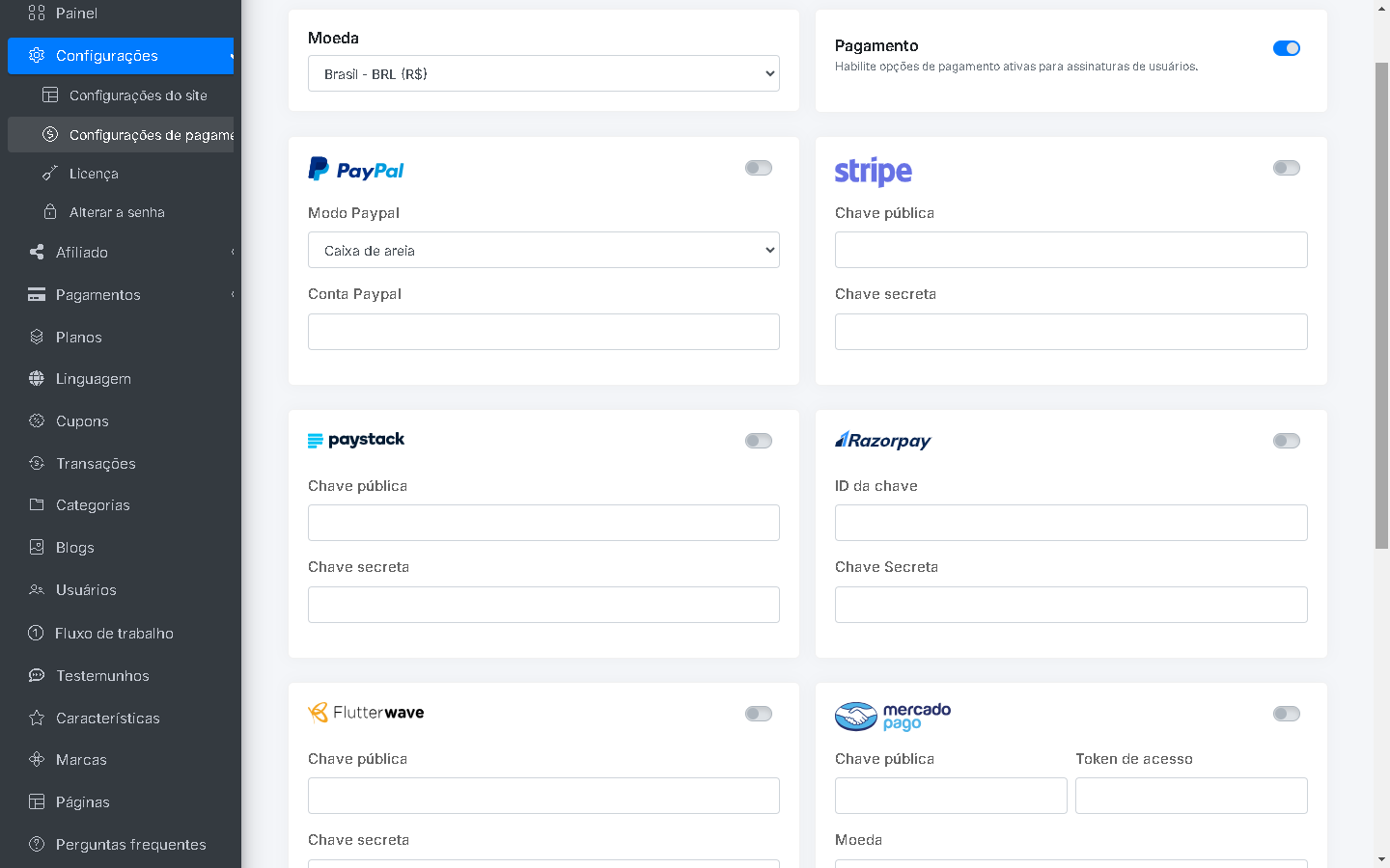 - Gerenciar configurações do site: se você quiser adicionar o nome do seu site, título, e-mail, telefone, sobre, logotipo, favicon, e-mails, moeda e opções básicas de SEO, links sociais, você precisa ir para a seção "Painel > Configurações" na barra lateral esquerda. Você pode gerenciar todas as opções aqui.