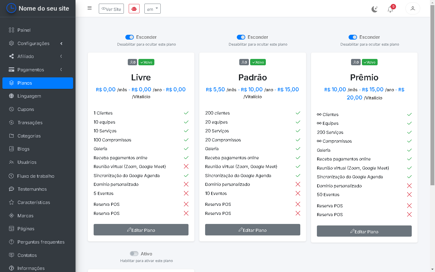 - Gerenciar planos e atribuir recursos: Se você quiser gerenciar seus planos e recursos, você precisa ir para a seção "Painel > Planos" na barra lateral esquerda. Você também pode atribuir recursos clicando no botão "Editar Plano" para gerenciar recursos para este plano.