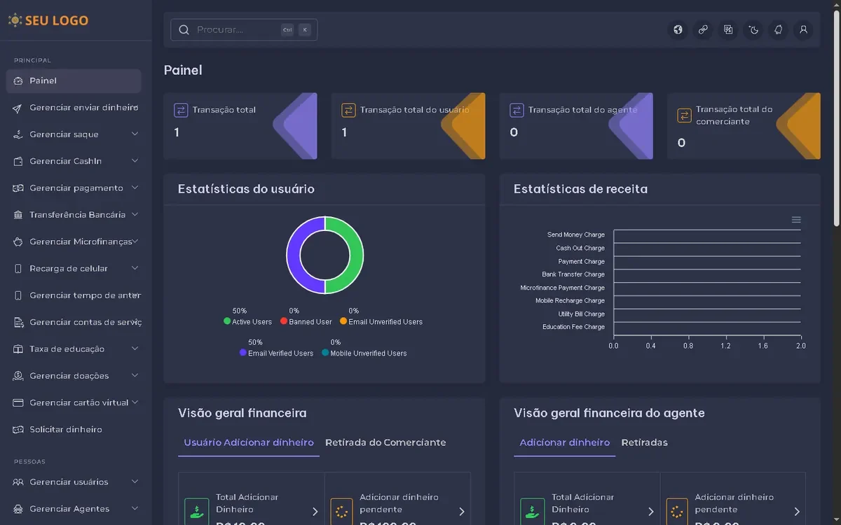 um painel de administração intuitivo e abrangente que fornece controle total sobre as operações da plataforma, desde o gerenciamento de usuários e transações até a configuração do sistema.
