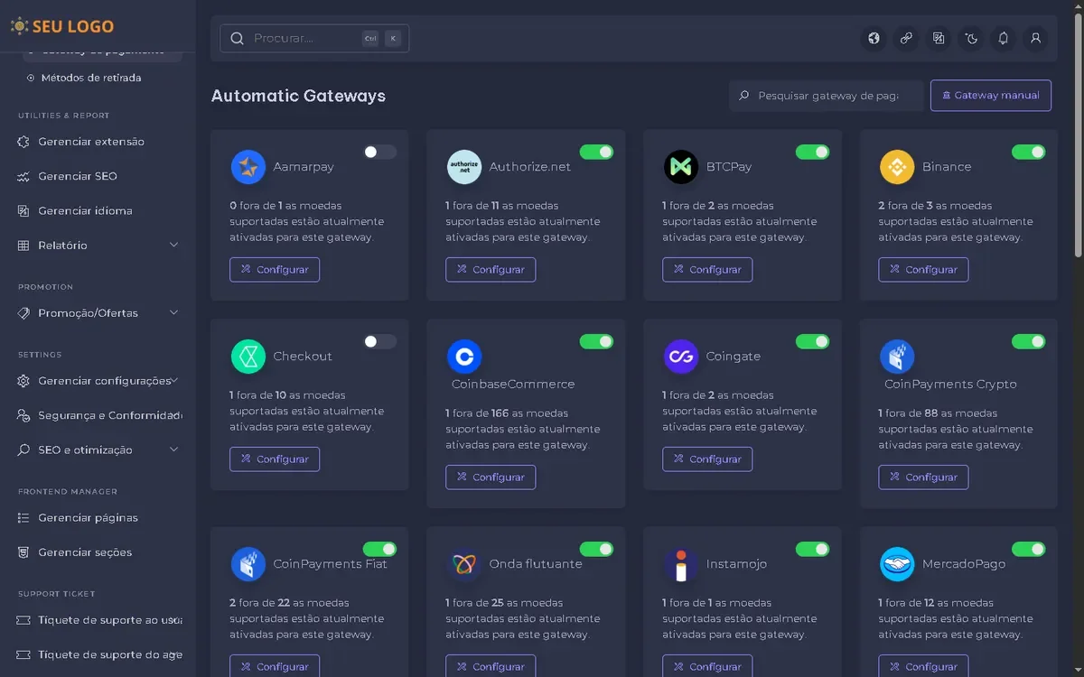 – Configuração de gateways de pagamento.