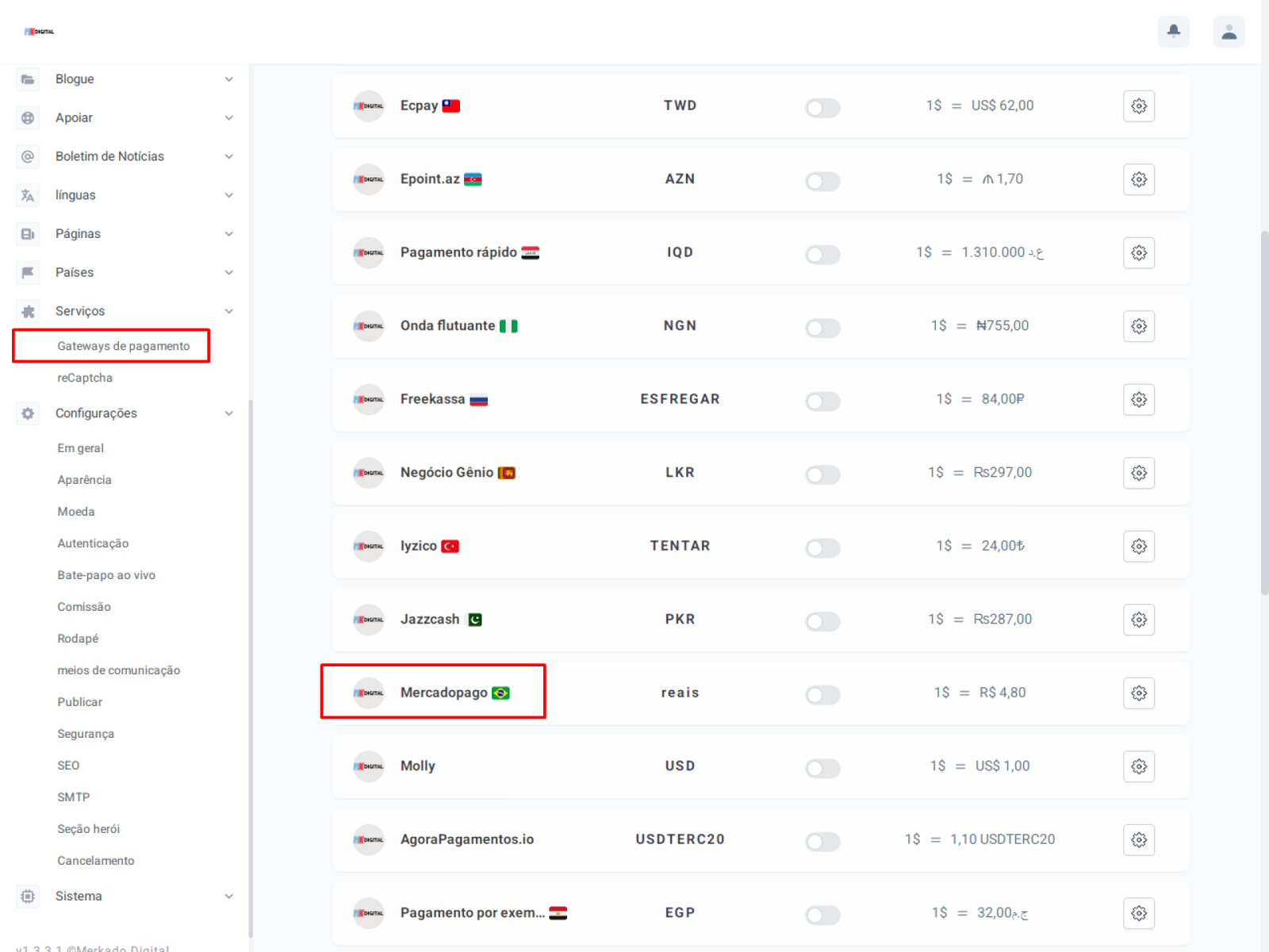 • Configurações de gateways de pagamento